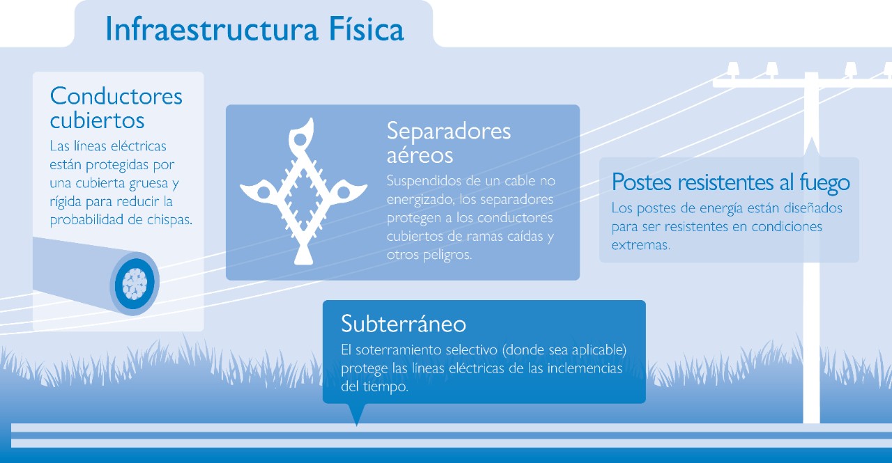 Estamos tomando medidas para mejorar la confiabilidad y reducir el riesgo de incendios forestales relacionados con los equipos. Estas medidas incluyen la sustitución de líneas eléctricas aéreas antiguas en zonas con mayor riesgo de incendios forestales por infraestructuras resistentes al fuego, como conductores cubiertos, y la instalación de líneas subterráneas en algunas zonas.